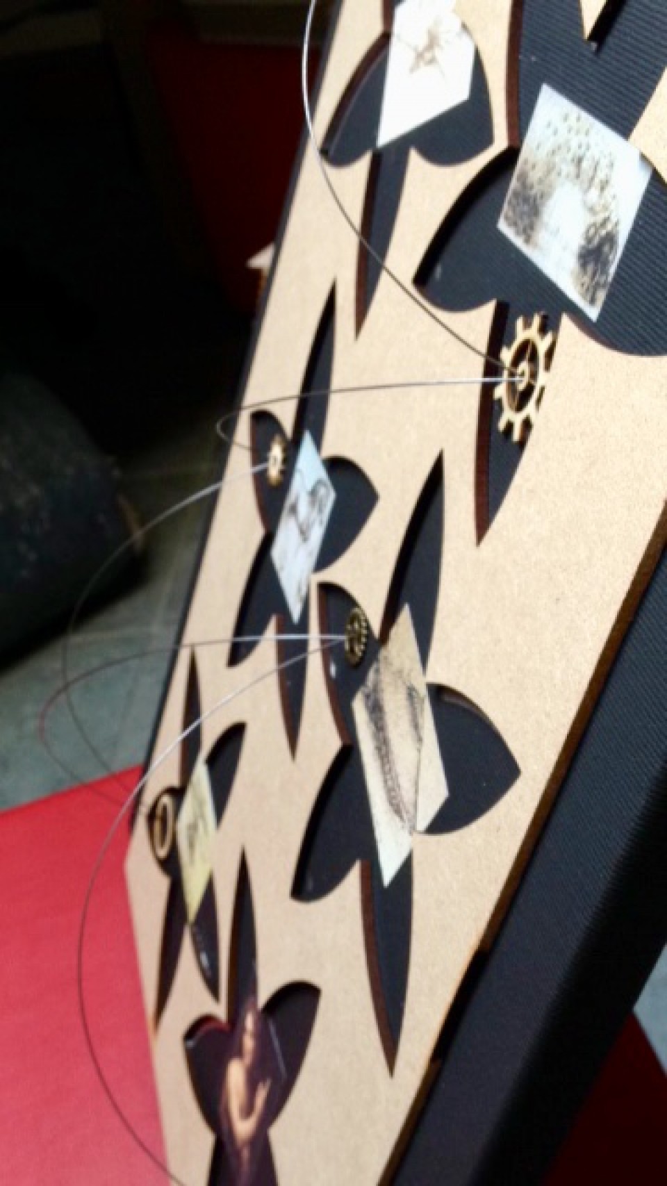 "Di pensiero in pensiero" (Danzando tra i progetto), della serie Leonardesca, unisce varie tematiche (dagli Sc-Art alle Traiettorie balistiche alle Minuterie metalliche). Misura cm 30x40x8.